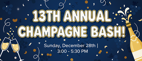 It’s our 13th annual Champagne Bash! There’ll be over 40 sparkling wines and champagnes, at least eight wine reps and fabulous food selections! We’ll have caviar, raw oysters, shrimp, and appetizer plates!